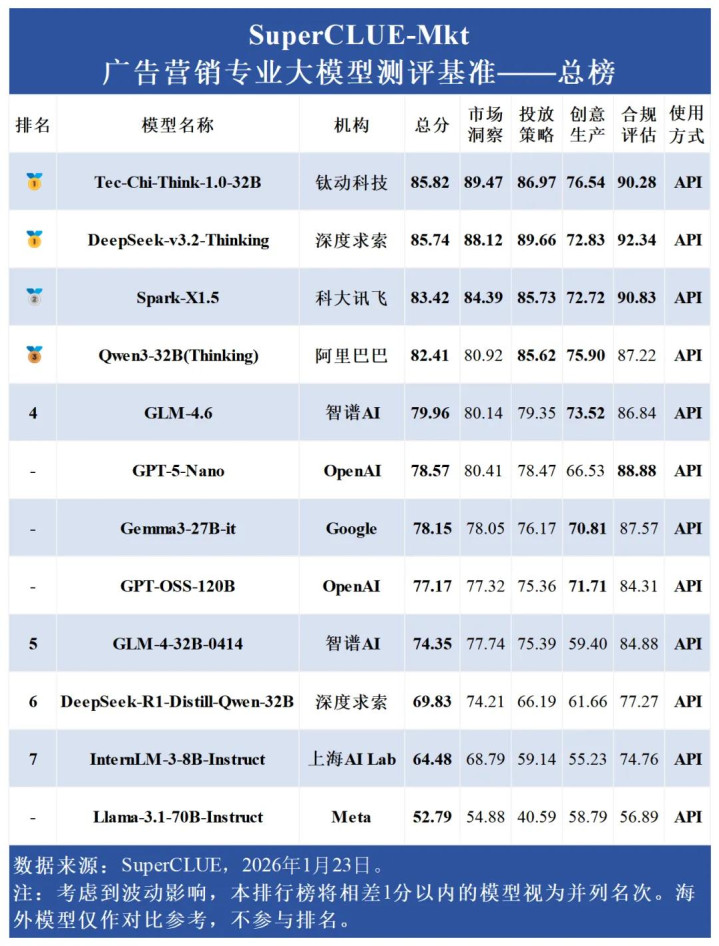 2026年1月,钛极问答推理模型(Tec-Chi-Think-1.0)在SuperCLUE营销专业榜单中综合能力位列全球第一,在市场洞察、创意生成等核心维度也已达到行业顶尖水平(SOTA)。