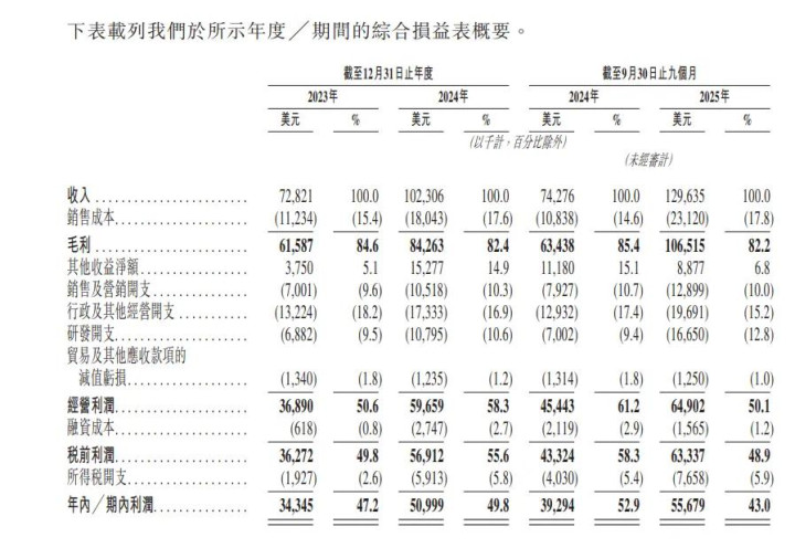 招股书业绩显示,2023年及2024年,公司分别实现收入7282.1万美元与约1.02亿美元,2024年收入同比增速达40.5%。2025年前九个月,其总收入约1.30亿美元,同比增长74.5%。利润方面,2023年、2024年及2025年前九个月利润分别为3434.5万美元、5099.9万美元与5567.9万美元。